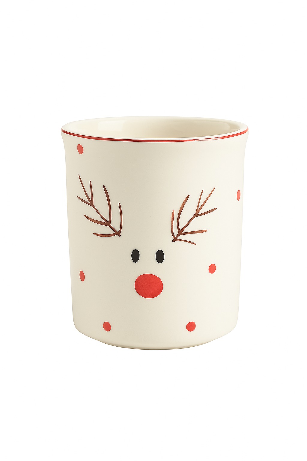 Feito em faiança de alta qualidade e pintado à mão, este copo apresenta um doce rosto de rena com detalhes vermelhos e castanhos, complementado por pequenos pontos festivos que lhe conferem um toque alegre e acolhedor.