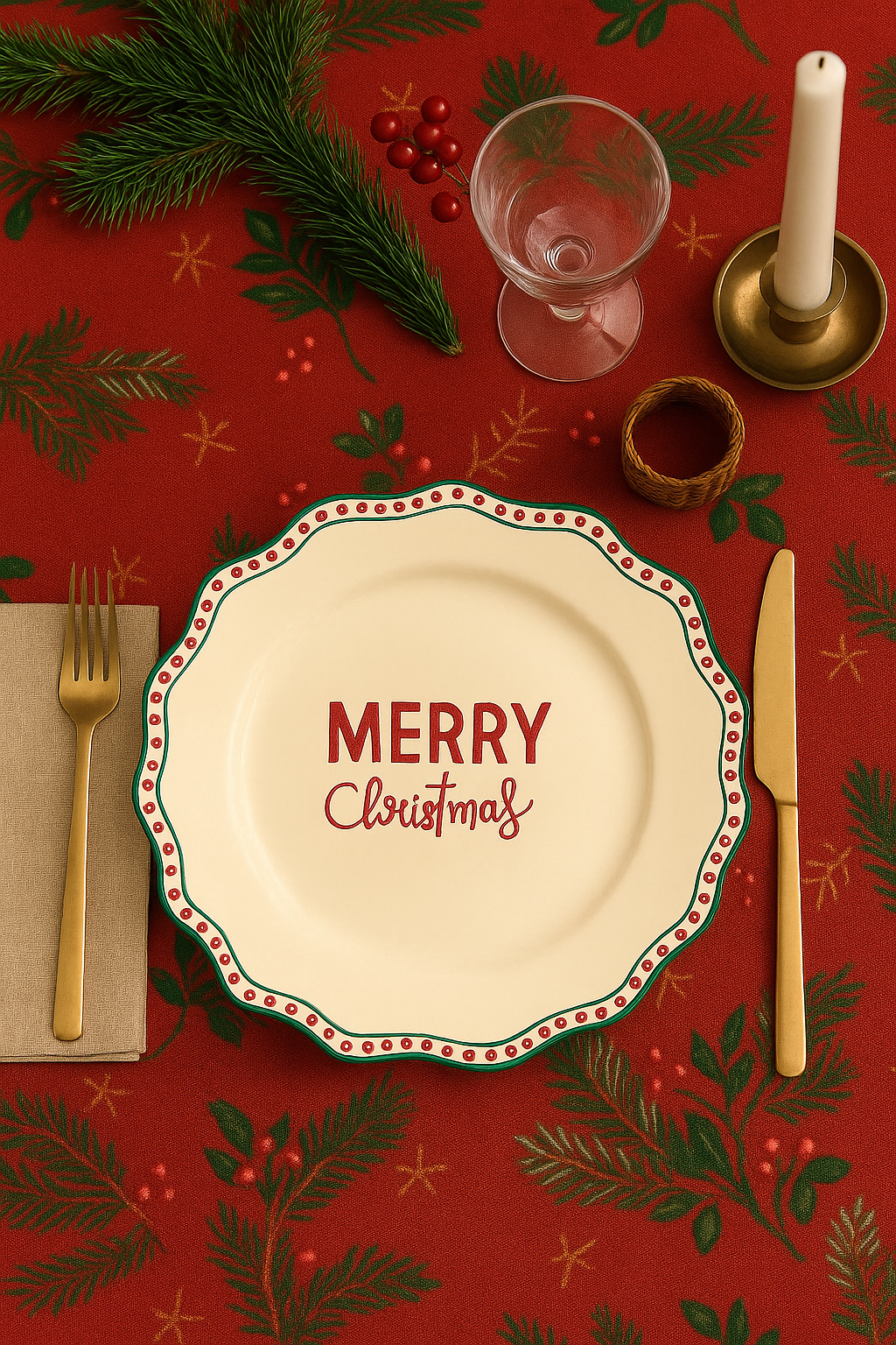 O rebordo ondulado, decorado em tons de vermelho e verde, confere-lhe um toque artesanal e acolhedor — perfeito para compor uma mesa cheia de charme durante a época festiva.
