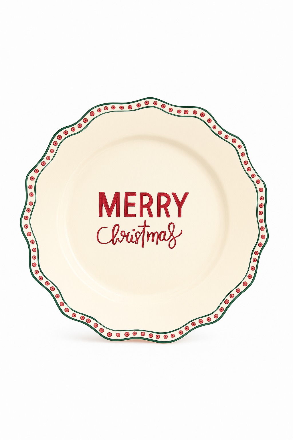 Produzido em faiança portuguesa e pintado à mão, este prato destaca-se pela sua borda ondulada e pelos detalhes em vermelho e verde que emolduram a mensagem festiva “Merry Christmas”.
