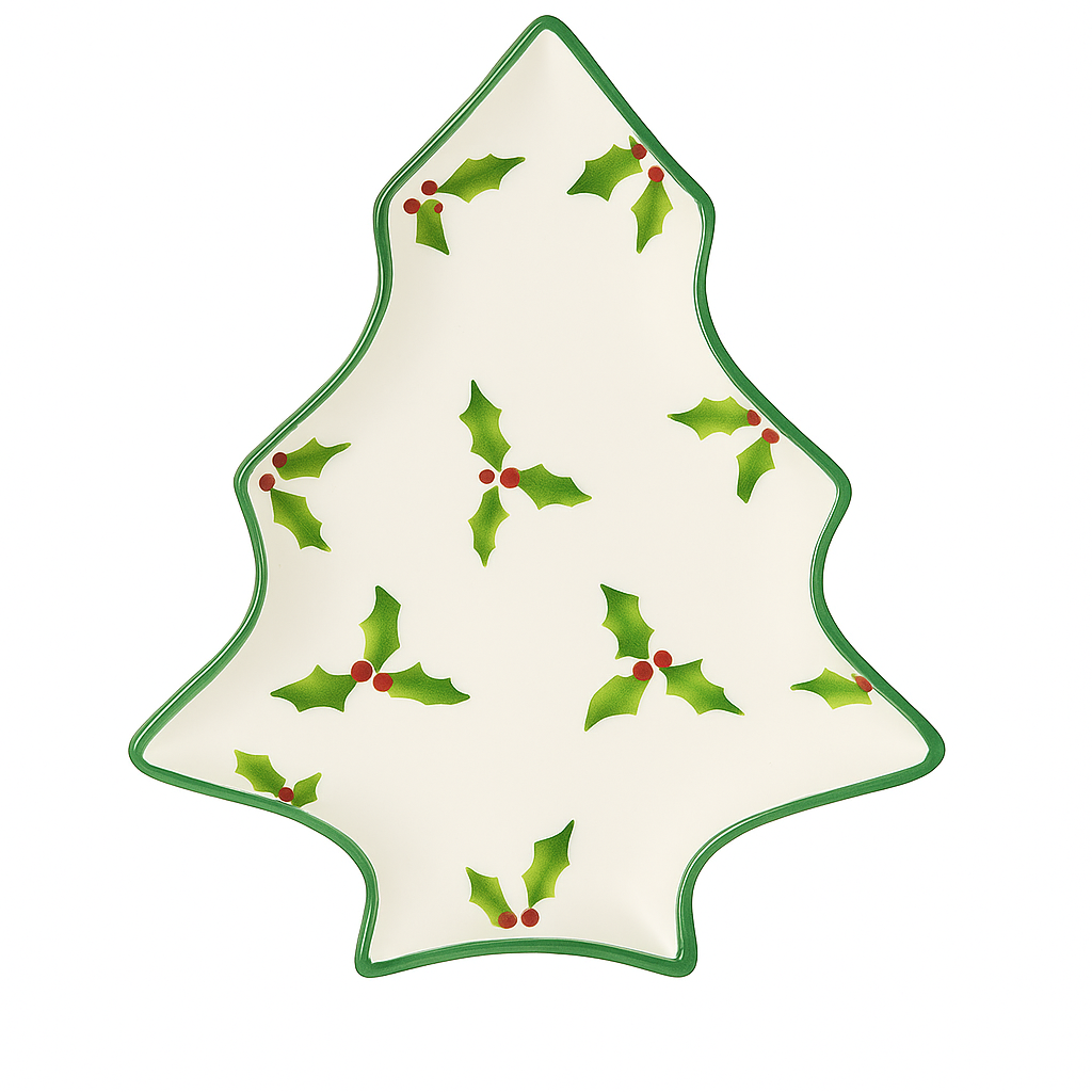 Feita em faiança de alta qualidade e pintada à mão, apresenta um formato de pinheiro decorado com folhas de azevinho e bagas vermelhas, realçado por um elegante rebordo vermelho que lhe confere um toque festivo e vibrante.